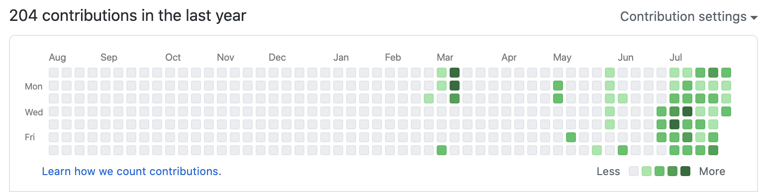 7월 한달을 막상 지내고 보니 25일은커녕 showmethatcode 팀원들과 제주도 여행 출발한 날 당일 빼고는 하루도 빠짐없이 코딩을 하고 커밋을 했다. 사실 커밋이라는 게 대단한 건 아닌 게 그냥 공부 기록을 올리는 것뿐인데, 어찌 됐든 7월 내내 코딩은 열심히 하고 살아왔음을 느껴서 뭔가 뿌듯했다. 습관화되는 게 중요하다고 생각했다. 동아리원들 중 일부와 같이 자바스크립트 공부를 하기 위해 스터디를 만들었는데, 거기서 나는 스터디원들에게 과제 인증을 꼭 GitHub에 커밋하고 그 주소를 올리라고 한다. 대학생들은 아직 Git에 익숙하지 않은 비율이 훨씬 높은 것 같다. 실제로 내가 있는 코딩 동아리에서 절반 이상이 동아리에 들어올 당시 GItHub 계정이 아예 없었다.