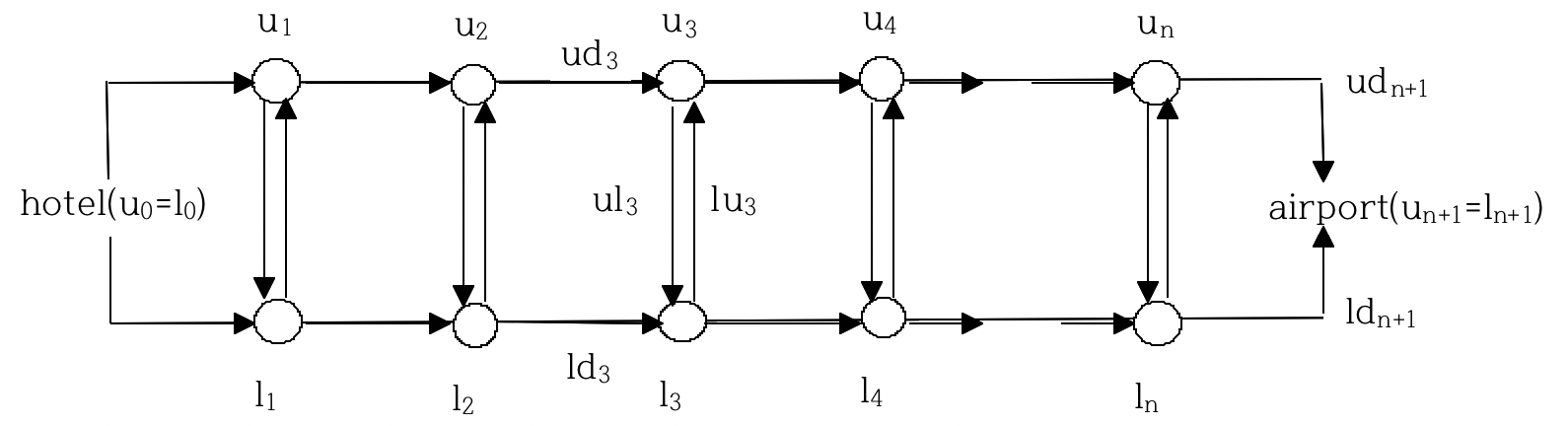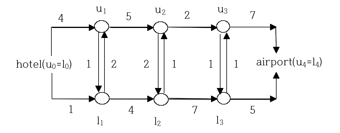 위쪽 도로에 n개 교차로 u1, u2, …, un이 있고, 아래쪽 도로에 n개 교차로 l1, l2, …, ln이 있다. u0(=l0)는 호텔을 나타내고, un+1(=ln+1)은 공항을 나타낸다. 그리고 i <= i <= n+1에 대해 위쪽 교차로 ui-1에서 ui까지 도로를 지나는데 걸리는 시간 udi과, 아래쪽 교차로 li-1에서 li까지 도로를 지나는데 걸리는 시간 ldi과, 그리고 교차로 ui에서 li까지 도로를 지나는데 걸리는 시간 ul와, 교차로 li에서 ui까지 도로를 지나는데 걸리는 시간 lui가 주어진다.