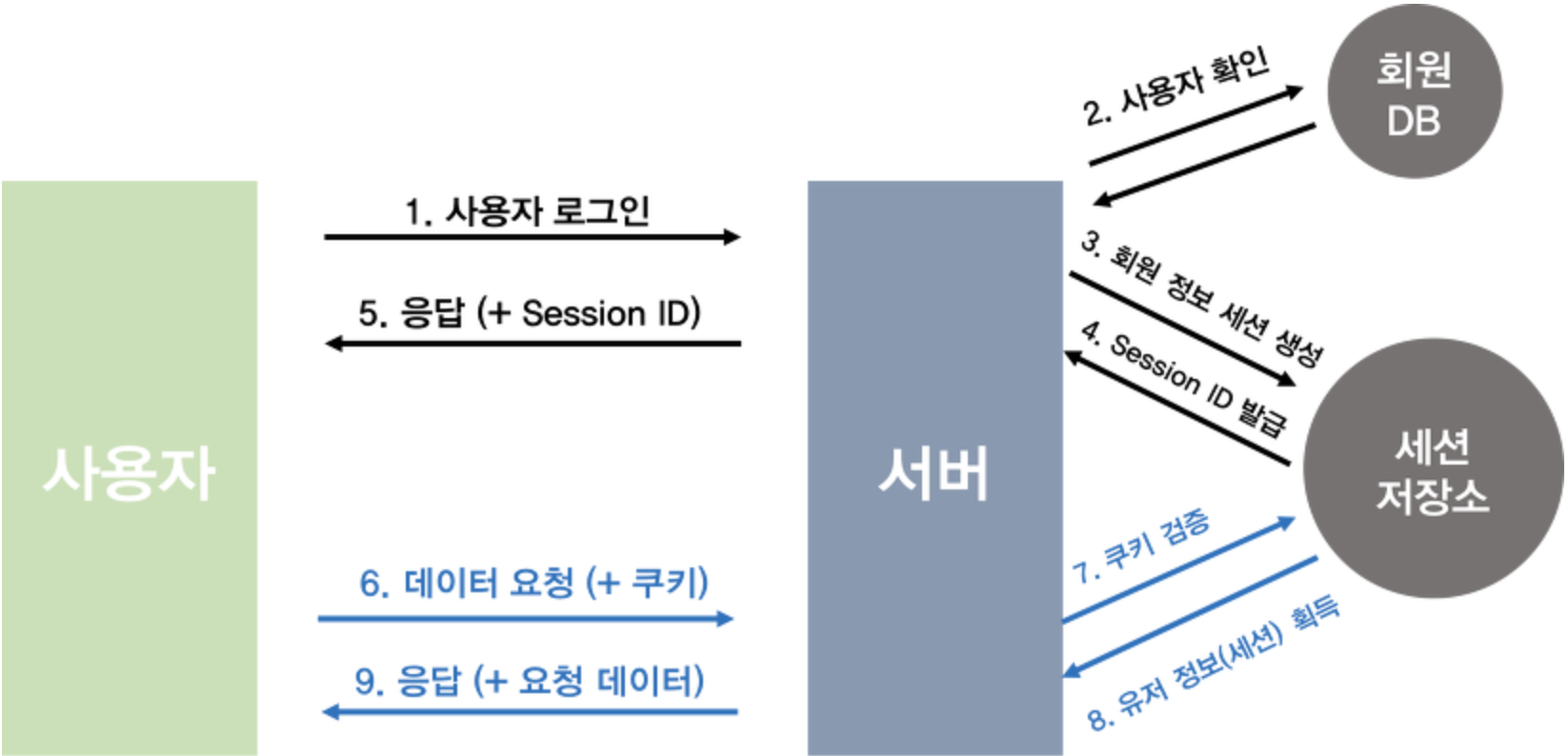 2. 서버에서 계정 정보를 읽어 사용자를 확인한 후, 사용자의 고유한 ID값을 부여하여 세션 저장소에 저장. 그 후 이와 연결되는 세션 ID(쿠키) 발급
