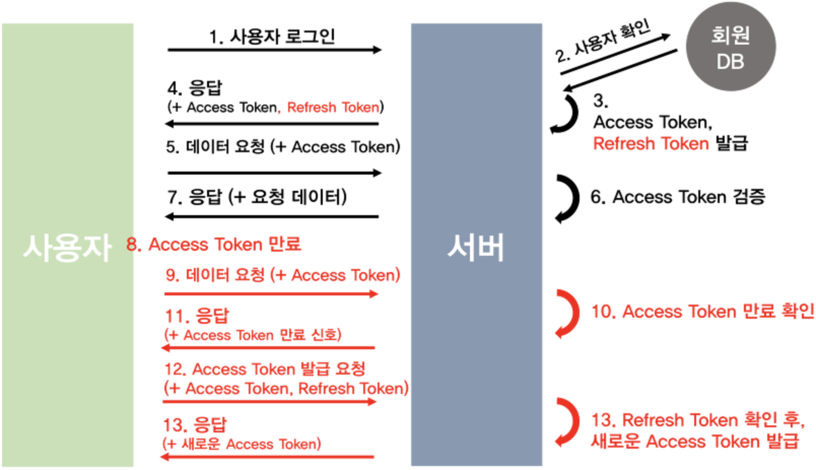 10, 11: 서버가 Access Token이 만료됨을 확인하고 권한없음을 신호로 보낸다.