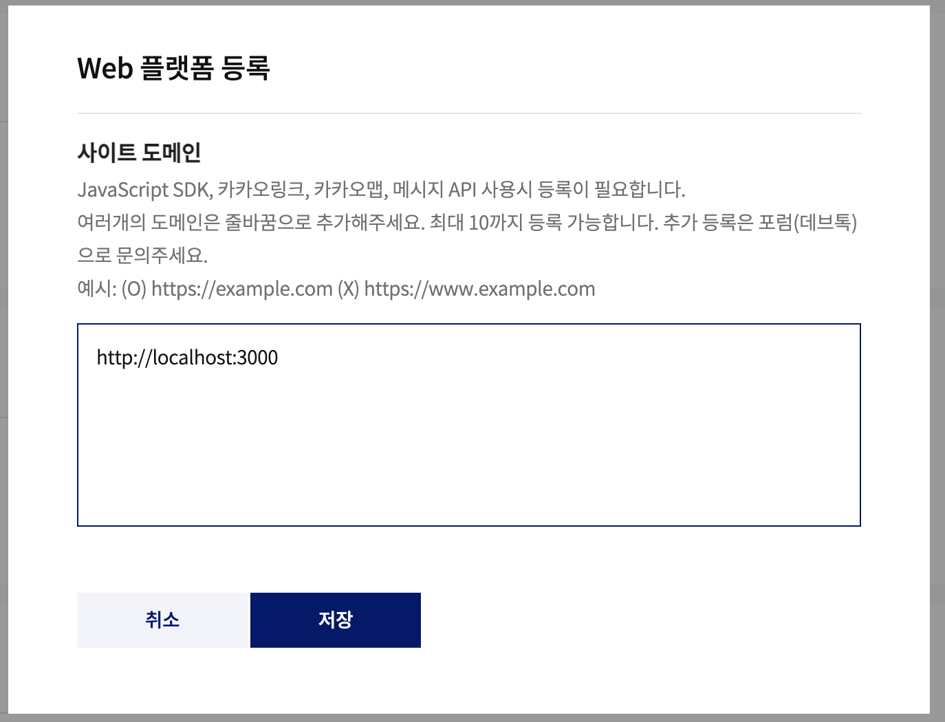 이 키들을 사용하기 전에, 우선 플랫폼 등록부터 해야한다. 좌측 앱 설정 > 플랫폼을 들어가면, Android, iOS, Web의 플랫폼을 등록할 수 있다. 나는 React 환경에서 개발하므로 localhost:3000으로 플랫폼 등록을 했다.
