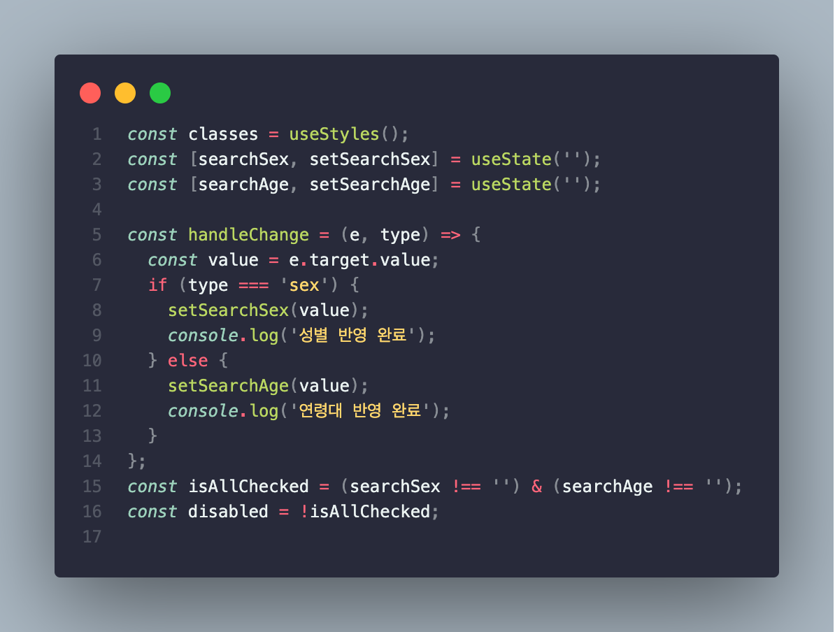 isAllChecked라는 변수에, 기존의 checkbox 상태관리 때에는 체크된 것들의 length가 2인지 아닌지의 여부를 판단했으나, 여기서는 searchSex와 searchAge의 값이 전부 존재할 경우로 설정해줬다.
