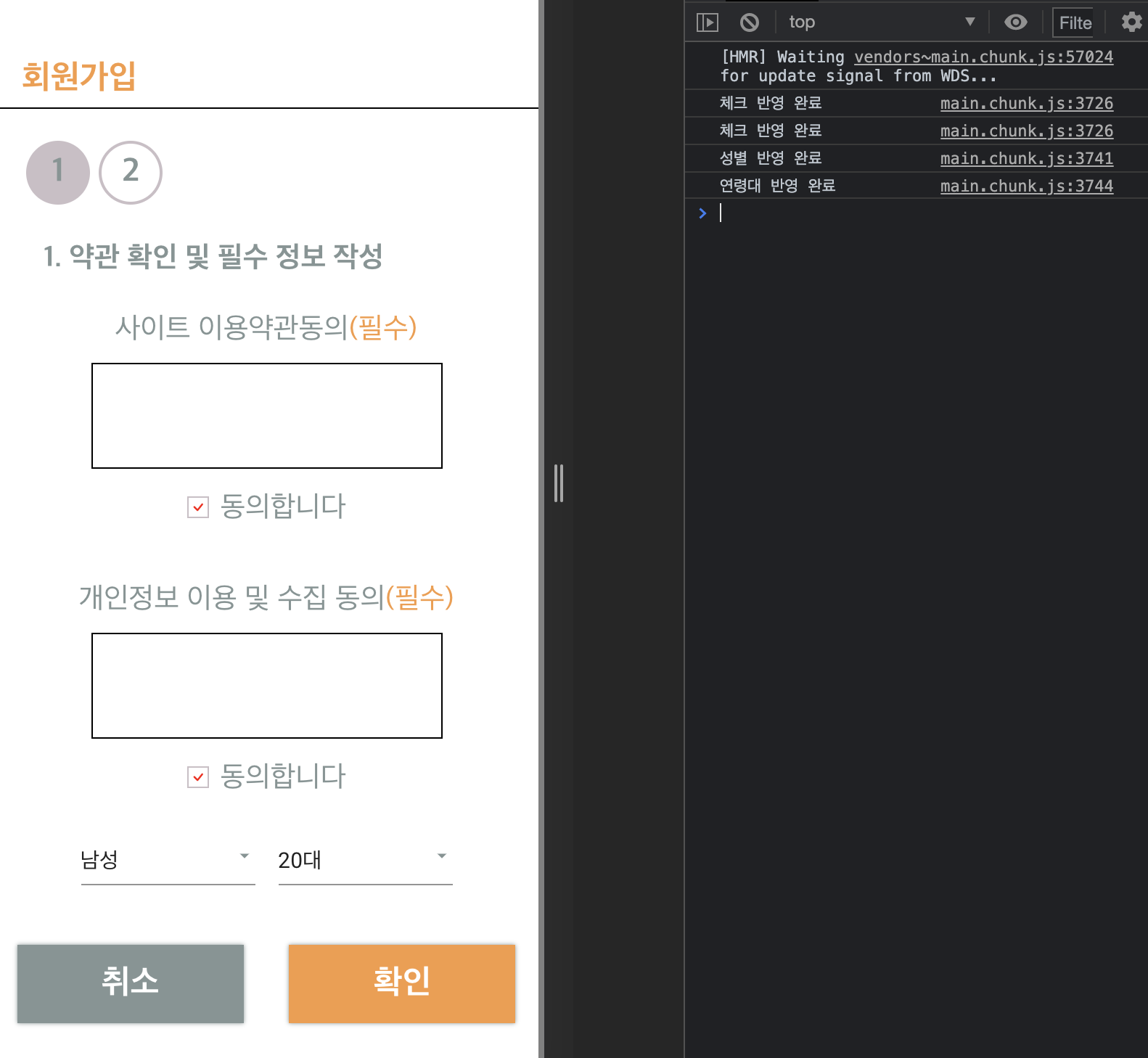 기본적으로 Material-UI에서 제공하는 것들을 import해준 뒤(앞 사진) handleChange 함수를 type에 따라 구분하였고, useState를 활용하여 현재 선택된 값(e.target.value)을 성별에 설정(setSearchSex), 연령대에 설정(setSearchAge) 해줬다(뒷 사진).