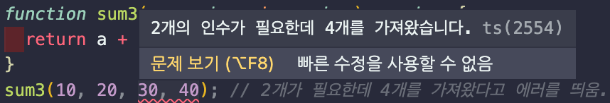a와 b, 그리고 반환값에 타입을 지정해줬다. 위 코드 같은 경우는 에러를 반환하는데, 그 이유는 sum 함수에서 파라미터를 2개만 지정했기 때문이다.