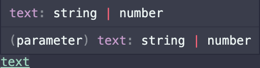 이제 text에 string | number로 유니온 타입 형태로 타이핑을 해주었다. 이 경우에는, 아래 두 줄을 보면 문제점을 확인할 수 있다.