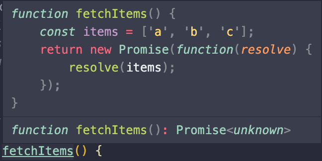 그러면 이 함수는 위와 같이 Promise<unknown>의 타입을 가진다. 이는, return new Promise의 타입을 알 수 없기 때문이다. 그래서,