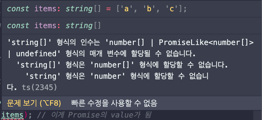 Promise<string[]>의 형태로 타이핑을 해주면 된다. 위에서 <string[]>로 제네릭 선언을 해줬으므로 items에도 string[]으로 타입 선언을 해 준다. 이렇게, items는 string[]으로 타입 정의가 되어있는 상황인데, 만약 Promise의 제네릭을 <number[]>로 바꾸면 어떻게 될까? 당연히 에러가 뜰 것이라고 에상할 수 있다. 왜냐면 items는 문자열 배열 형태로 타이핑이 돼있기 때문이다.