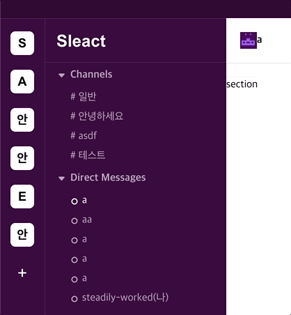 현재 DM에 사용자로 등록되어있는 'a', 'aa', 'a', 'a', 'a' 이렇게 5개의 계정은 각각 로그인 및 회원가입 페이지를 만들 때 임시로 만들었던 계정들이다. 회원가입을 하면 자동으로 DM 섹션에 추가가 되는 것이다. 사실 실제 슬랙에서는 이 워크스페이스에 사용자를 초대해야 DM 섹션에 뜨게 되지만, 어쨌든.. 회원가입을 한 값이 여기에 추가된다는 게 중요한 게 아닐까? 싶다.