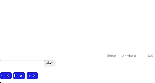 기능은 값을 적고 엔터를 누르거나(+콤마, 스페이스바) 버튼을 클릭했을 때 배열에 들어가게 되며, 입력했을 때 이미 배열에 있는 값이라면 추가되지 않게끔 하는 작업이다.