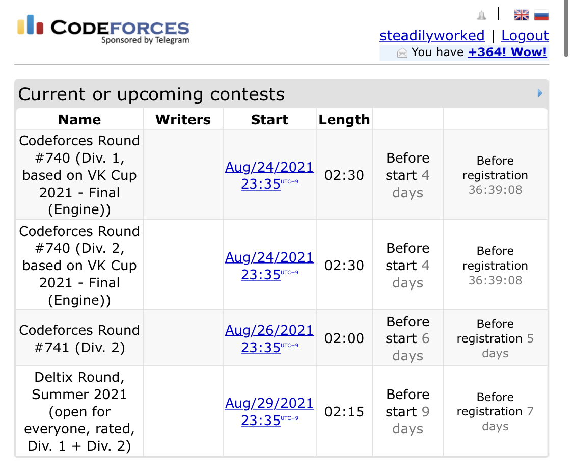 여기에 들어가면, 위 사진처럼 예정되어있는 대회들을 확인할 수 있고, Before registration 시간이 다 지나면 등록 버튼이 활성화된다. UTC를 기반으로 하기 때문에 KST 기준으로는 +9시간 뒤에 시작된다. 그래서 밤 11시 35분에 시작된다. 나는 가장 쉬운 div3 대회를 등록하고 한 문제만 풀고 나왔다. 한 문제밖에 안풀어서 안될 줄 알았는데, 다행히 예상한 대로 되었다. div3이라서 아주 쉬울 줄 알았는데, 생각보다 막 쉽지는 않았다. 1번 하나 풀었는데, 이 문제도 다시 한 번 봐야겠다고 생각했다.