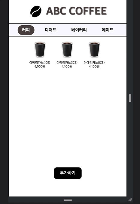 아직 미완성이다. 문제는 우리가 처음 키오스크를 접했다고 했을 때 보통은 첫번째 카테고리에 기본적으로 고정이 되어있는 상태에서 다른 카테고리를 눌러서 들어가는 방식이기 때문에 처음 이 페이지에 들어갔을 때는 커피에 해당하는 JSON값이 출력이 되어있어야 한다는 것인다. 근데 커피에 해당하는 JSON 값 출력은 움짤에서 보다시피 했지만 저 카테고리 버튼이 처음에 커피에 focusing이 되어있게 하는 방법은 아직 모르겠다..